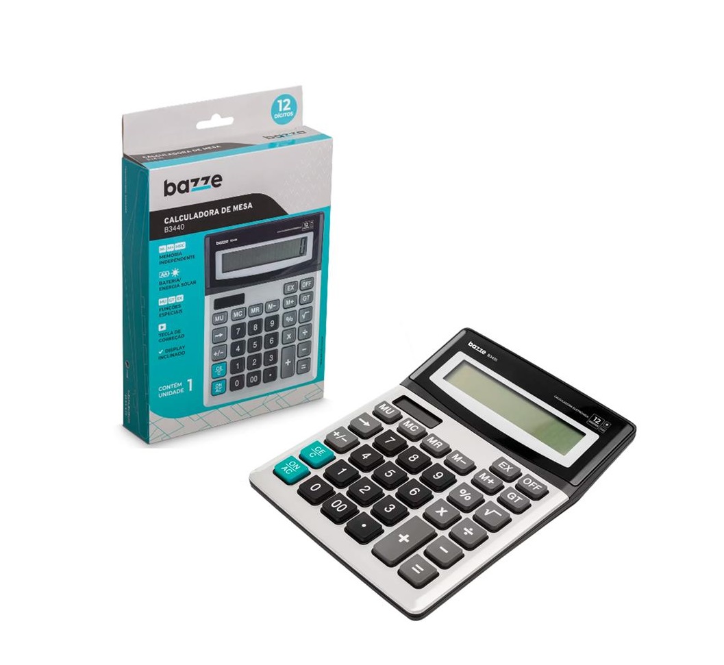 A calculadora de mesa B3440 possui superfície metálica, que garante alta durabilidade! É 12 dígitos e possui alimentação dupla: pilhas e energia solar! Com desligamento automático e memória independente, além do big display inclinado, tecla de correção e função grand total.