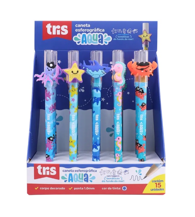 A caneta esferográfica Tris Aqua possui toppers temáticos, inspirados no fundo do mar! Sua ponta é média, 1.0mm e seu corpo é estampado. Tinta azul!