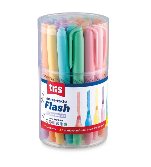 O marca texto Flash possui tinta de alto brilho, ideal para papel normal e fax! Cores vibrantes, que proporcionam super destaque do texto no papel e ponta chanfrada, que permite traço fininho e grosso. Pote com 6 cor es pastel disponíveis: amarelo, laranja, rosa, roxo, azul e verde.