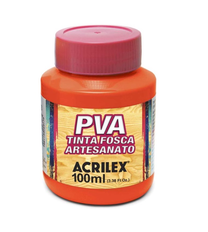 PVA Tinta Fosca Para Artesanato 100ml. A base de Latex P.V.A. Secagem rapida. Acabamento fosco. Pronta para uso. Pode ser aplicada com pincel, esponja ou rolinho de espuma. Diluente: Agua, Gel para Matizar, Medium Acrilico, Verniz Acrilico, Lacas, Acrilfix e Base Acrilica para Artesanato. Ideal para trabalhos artesanais sobre madeira, gesso, MDF, ceramica, cortica, isopor, papel, palha e PET (preparado antes com Primer Acrilex).