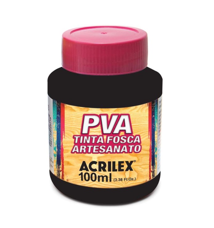 PVA Tinta Fosca Para Artesanato 100ml. A base de Latex P.V.A. Secagem rapida. Acabamento fosco. Pronta para uso. Pode ser aplicada com pincel, esponja ou rolinho de espuma. Diluente: Agua, Gel para Matizar, Medium Acrilico, Verniz Acrilico, Lacas, Acrilfix e Base Acrilica para Artesanato. Ideal para trabalhos artesanais sobre madeira, gesso, MDF, ceramica, cortica, isopor, papel, palha e PET (preparado antes com Primer Acrilex).